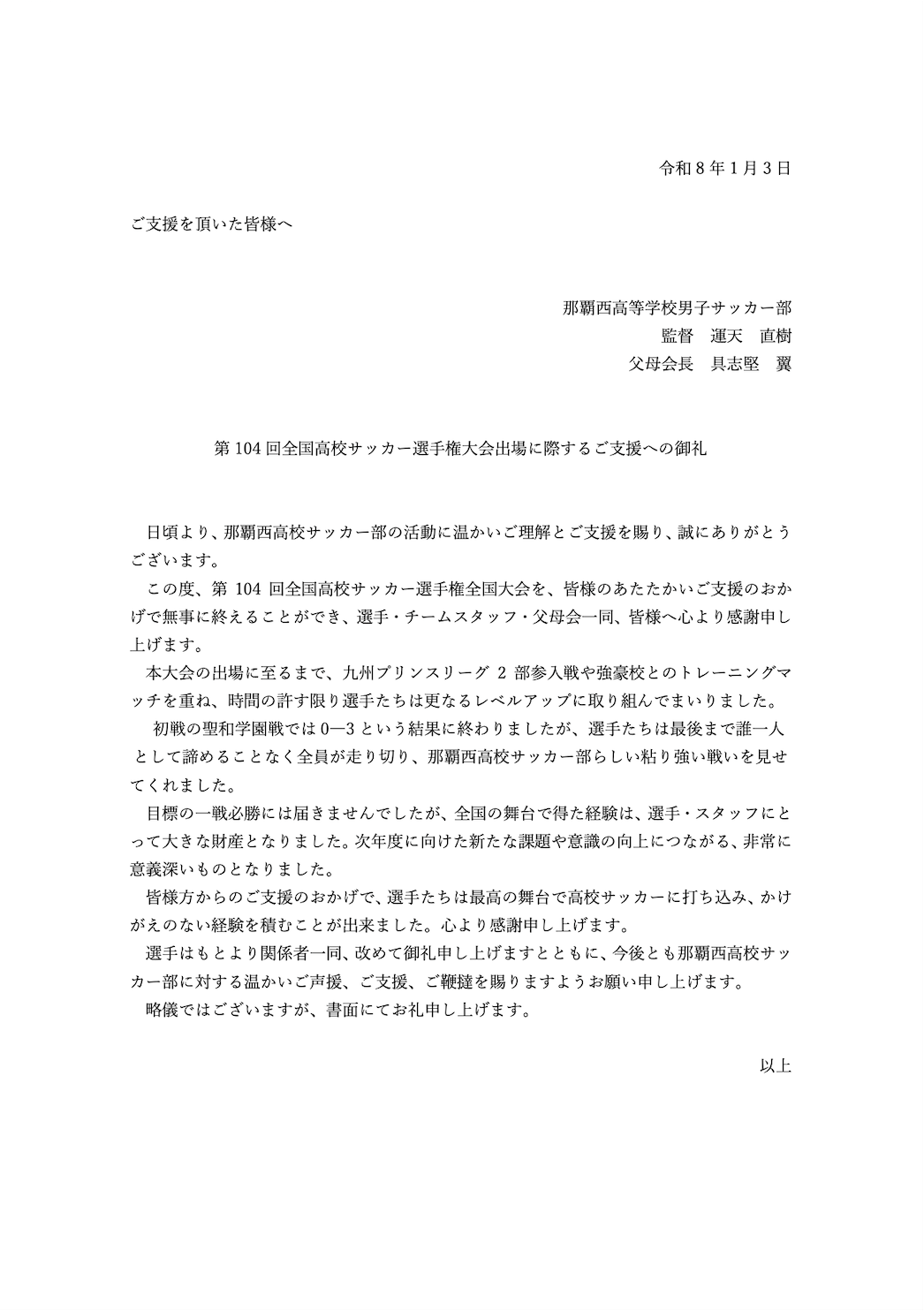 那覇西高校サッカー部はスポンサー、サポーター、保護者会など多くの方々に支えられております。